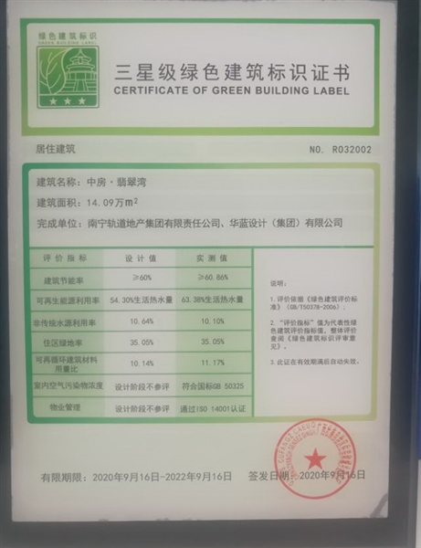 • 中房翡翠灣三星級綠色建筑標(biāo)識證書