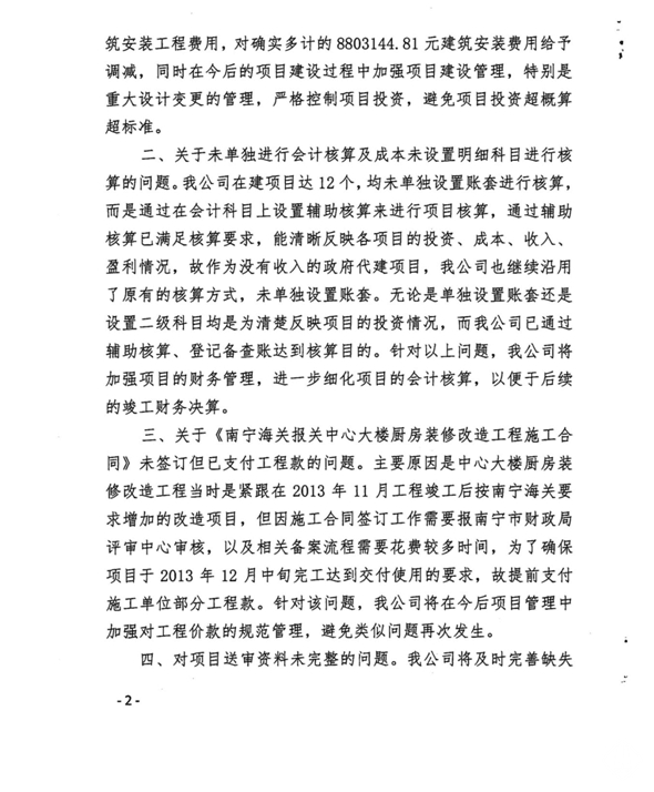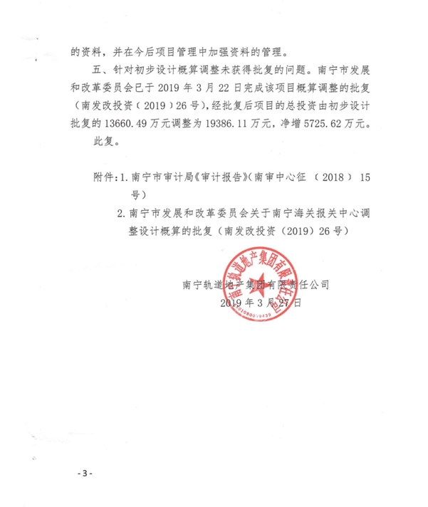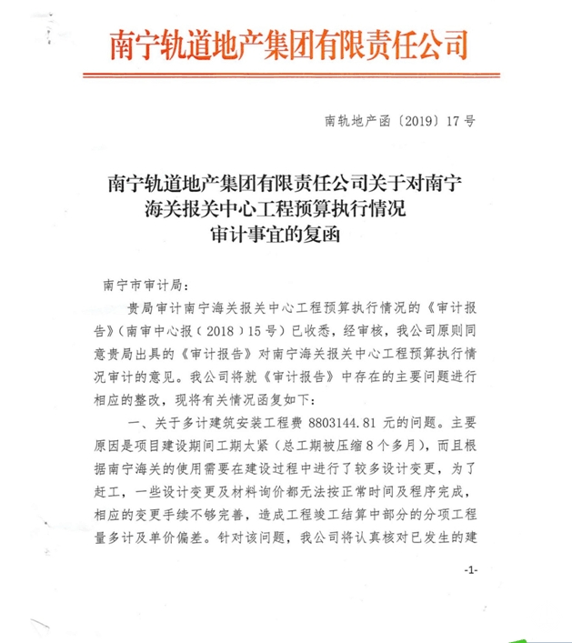 南寧軌道地產(chǎn)集團(tuán)有限責(zé)任公司關(guān)于對南寧海關(guān)報關(guān)中心工程預(yù)算執(zhí)行情況審計(jì)事宜的復(fù)函