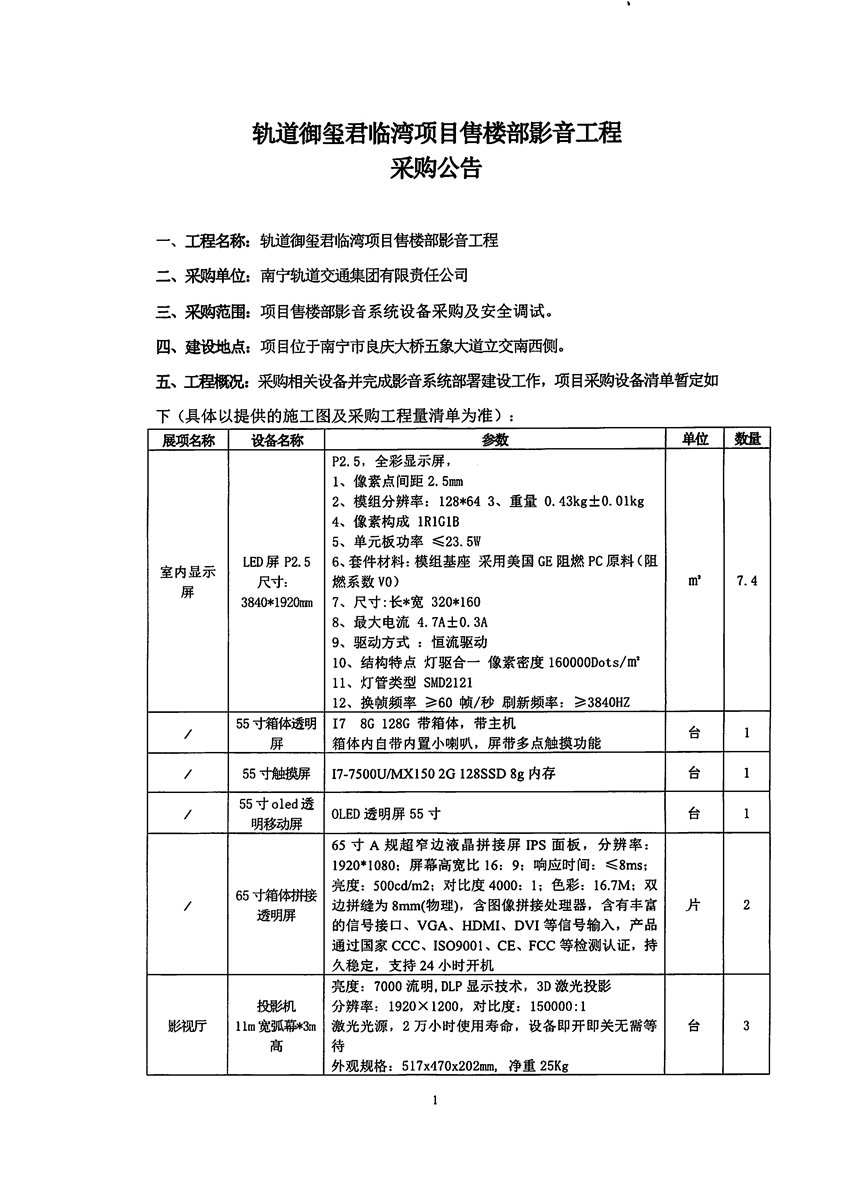 軌道御璽君臨灣項目售樓部影音工程采購公告